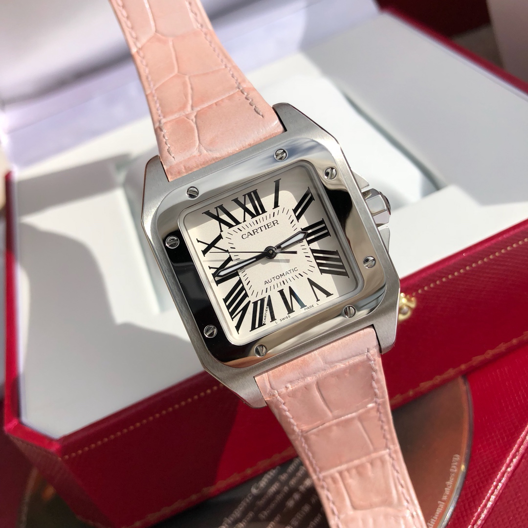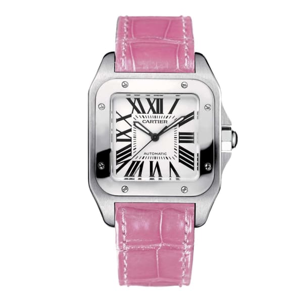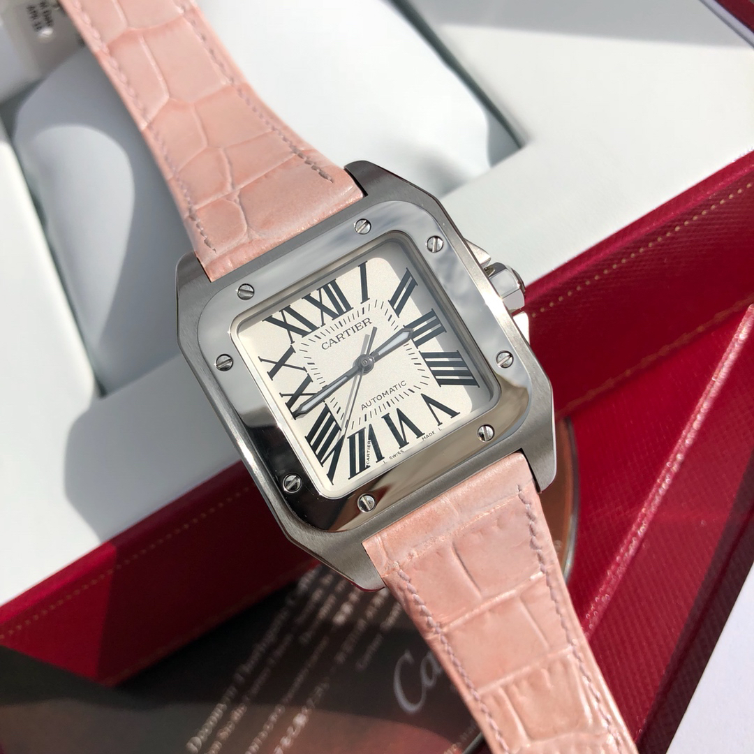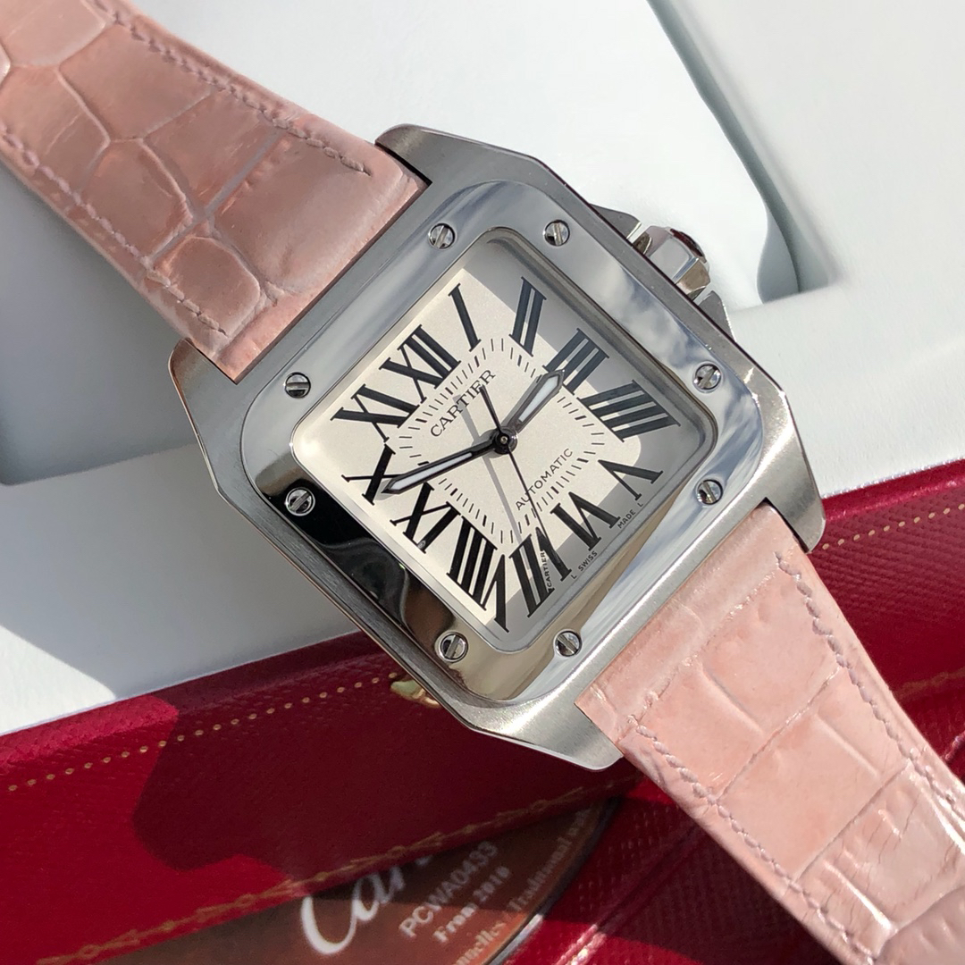 Cartier Santos 100 44.2*35.6mm Watch – Ref: W20126X8 – Silver Roman Dial, Pink Leather Strap