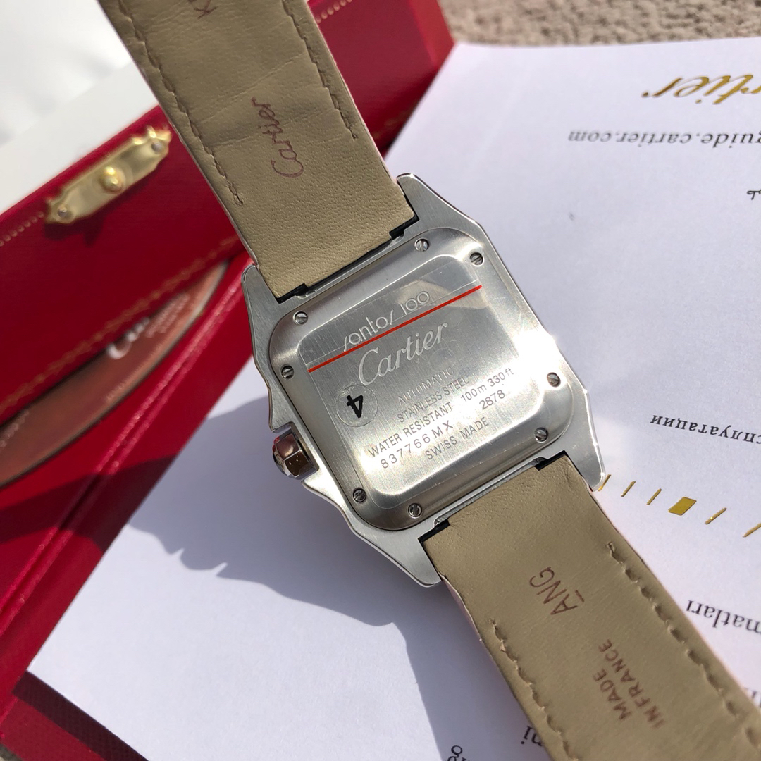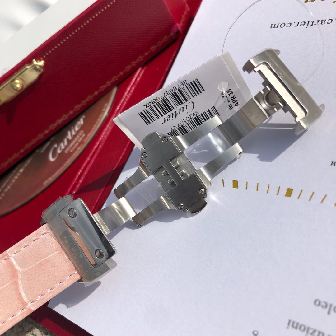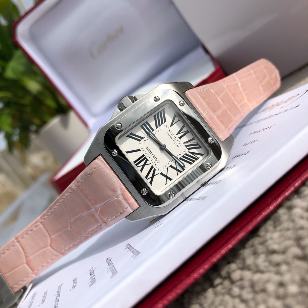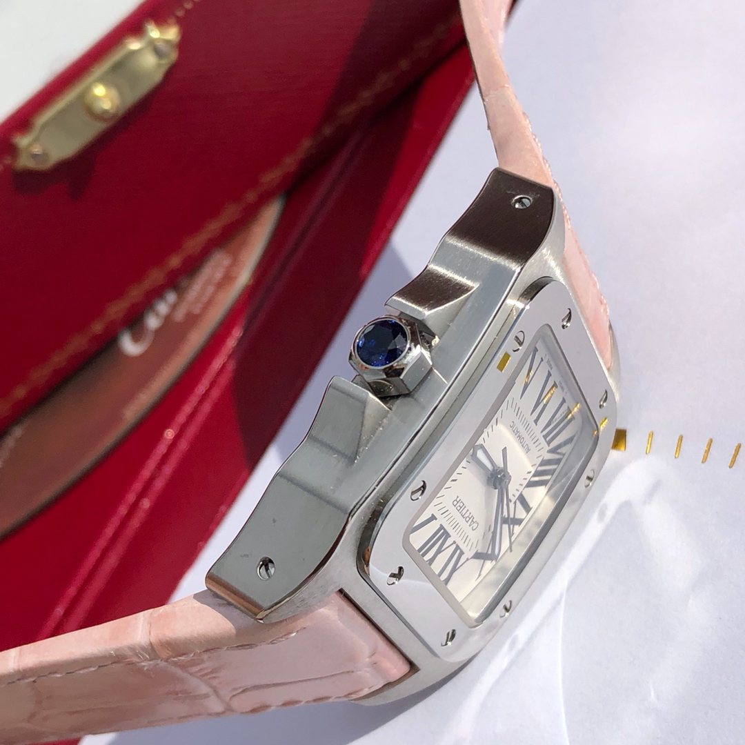 Cartier Santos 100 44.2*35.6mm Watch – Ref: W20126X8 – Silver Roman Dial, Pink Leather Strap