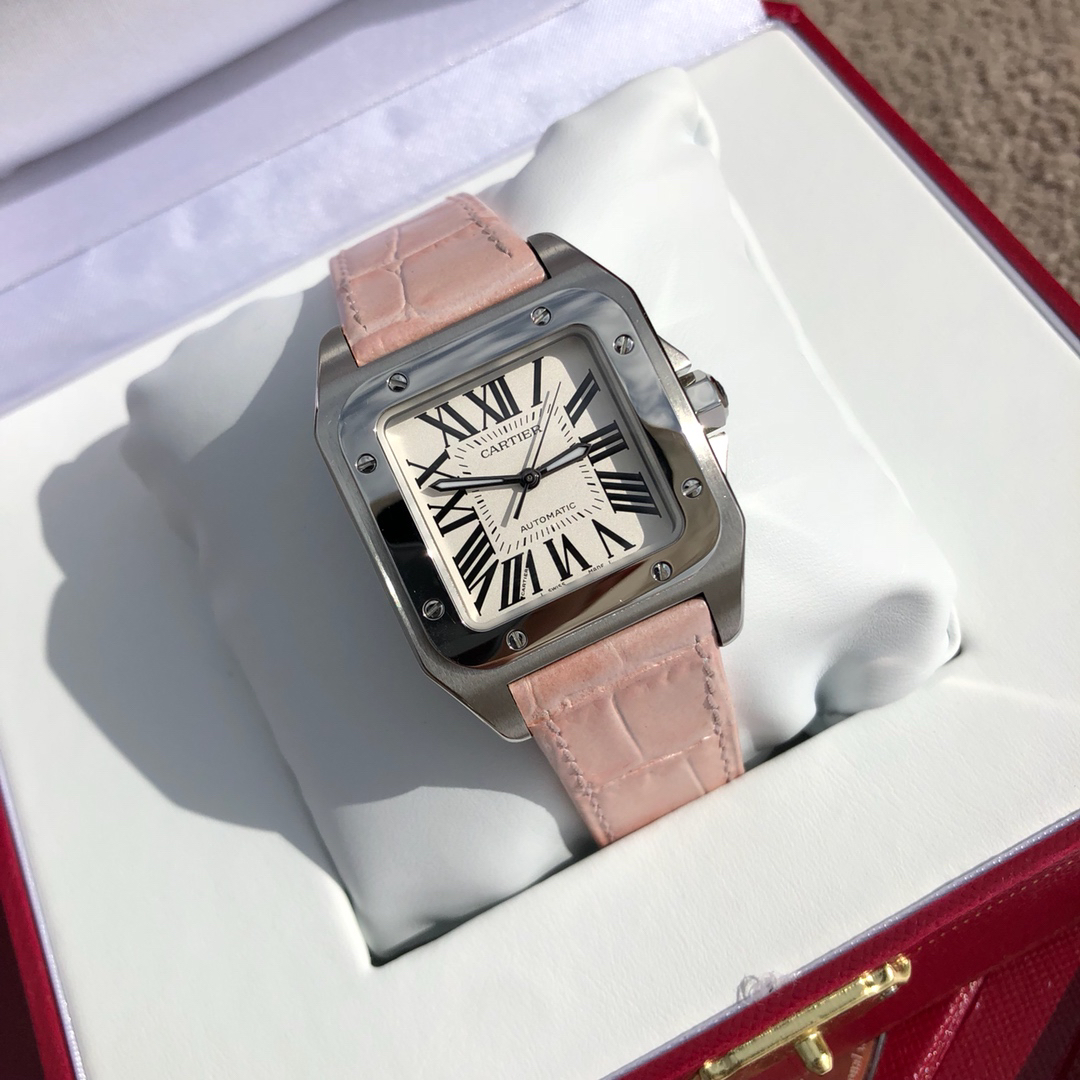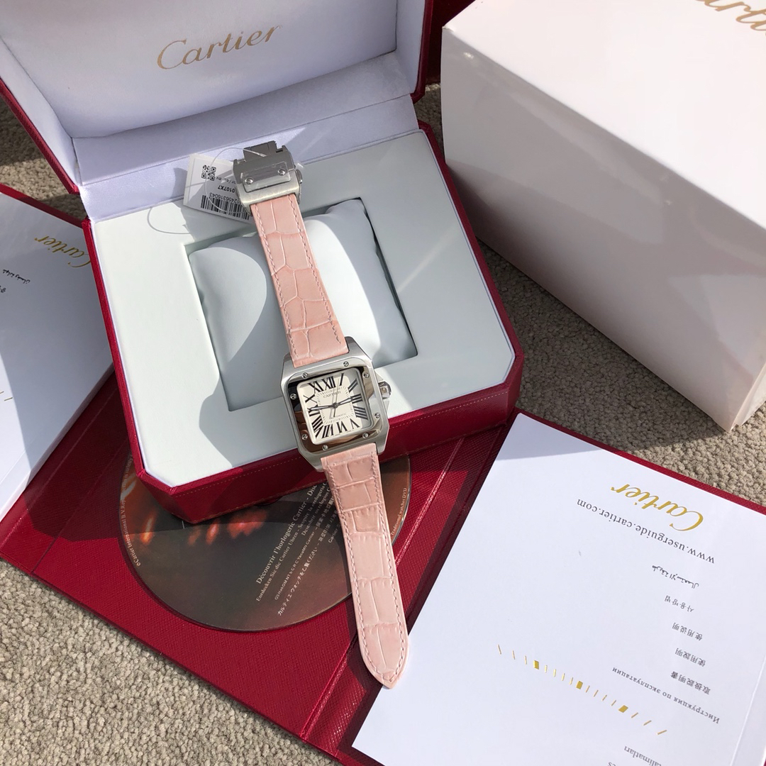• Cartier Santos 100 44.2*35.6mm Watch – Ref: W20126X8 – Silver Roman Dial, Pink Leather Strap